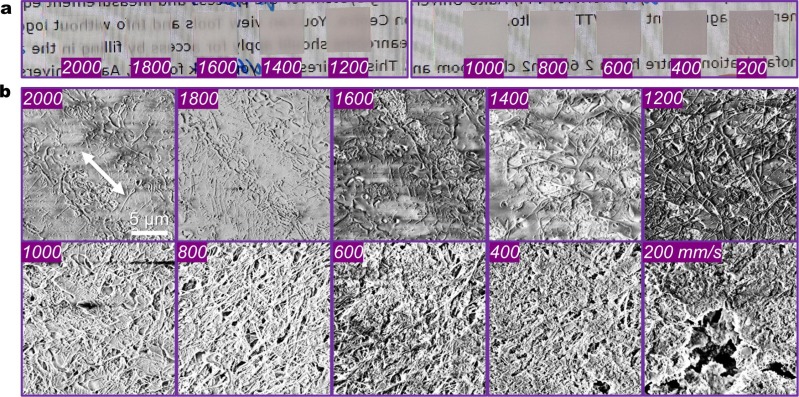 图1。(a) 照片及 (b)扫描电镜以不同速度 (mm/s) 处理的激光纳米结构玻璃的图像。注意在 (a) 中,激光处理的方形区域之间的透明区域是未处理的透明玻璃基板加工区域的尺寸为1厘米2。箭头指示激光扫描方向。相同的比例尺适用于所有扫描电镜图像。可以在参考文献中找到不同放大倍数下的原始分辨率SEM图像。